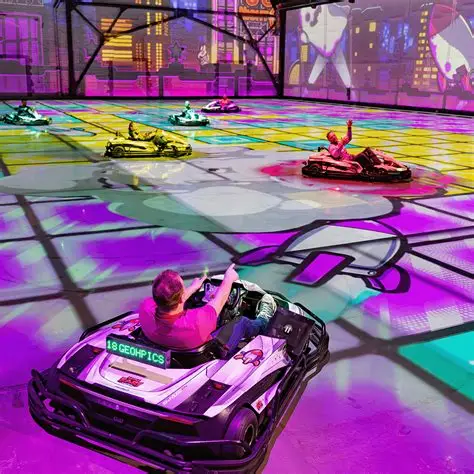 Race through fun-filled tracks where real go-karts meet video game-style challenges.